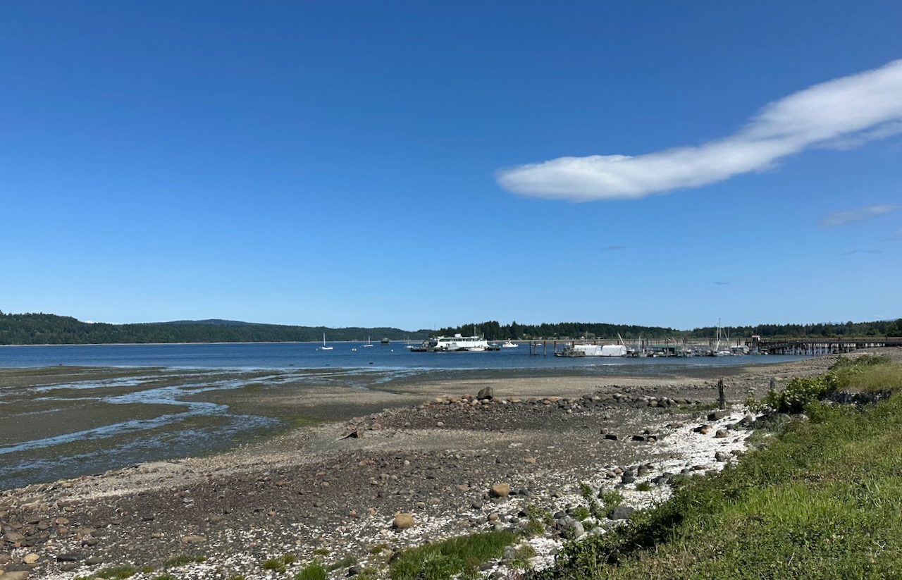 The course continued through Cobble Hill to Mill Bay. I took another break in Mill Bay for a treat at the Tim Horton’s. Then it was back on the bike to Shawnigan Lake, Cobble Hill and Cowichan Bay. There is some lovely, flat riding along the seashore and through the Cowichan Estuary. I was fortunate to be doing this section before the light failed. By the the time I reached Duncan, it was dark. There is a long highway section from Duncan to the Nanaimo airport. I wasn’t looking forward to it. Fortunately, traffic on the highway was light and the shoulders were relatively clean. The highway riding was more pleasant than I had feared. The clouds had disappeared; a crescent moon hung in the sky. It didn’t give much light but it was pleasant to look at. Unfortunately, the highway offered no shelter from the strengthening headwinds.