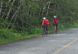 ![]() Photo of Murray on left (Photo by Fred Fowler - All other photos by Murray) Deirdre and Colin in right photo. Once off the highway, I stopped to look at the amazing display of stars. Actually I stopped for an altogether different reason but you probably don’t need those details. I pedaled on through Cedar and into Nanaimo. The moon, now low in the sky beckoned me on. It was late. I wasn’t going to have a lot of sleep. I had just over 3 hours of actual sleep before heading out for day 2. I felt stronger after having a sleep. Day 2 was an out and back in brilliant sunshine but with a fairly strong headwind on the way out. Our first control was at Buckley Bay. I stopped for a sandwich and met up with Deirdre and Colin. They too had struggled with last night’s headwinds. Despite the name of the course, the turnaround was in Comox. I stopped again for a treat at Tim Horton’s. Even with the wind, my speed was okay on the outbound leg.