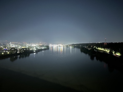 We rode through urban South Surrey on brightly lit streets with stops and starts at the numerous traffic lights. It was almost a shock when we returned to dark unlit streets as we continued west on the flat, straight road through Mud Bay. At the end of the road, we turned onto a series of gravel trails for about 8 km. The riding was easy enough but our pace was slow as we were negotiated the trails in darkness. At one point, I got too far ahead of Jeff. I stopped and switched off my light. The darkness was complete. It didn’t take long for me to wonder what sort of predators inhabited the forest. I was happy to be rolling again. We crossed the Alex Fraser Bridge into Queensborough and cycled along the banks of the Fraser River. A gibbous moon was rising over the river. It was much colder by the river. I was glad I had my long-fingered gloves. It was flat riding through Richmond until we eventually reached the Canada Line Bridge. Home stretch! From the bridge it was about 6 km of uphill riding through Vancouver to the finish line. The grades were easy and the residential streets were mostly deserted. We finished just before 3:00 a.m. at the Breka Bakery on Main St. Jeff and I congratulated each other on successfully completing a very long ride and went our separate ways. I stopped at the bakery for a treat—apple strudel—before tackling the 8 km, uphill ride back to where I was staying. A fine day on a bicycle—even if it was a bit long.