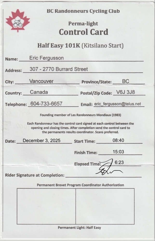Over to the Light Side... I was all in in October 2008. It was the dawning of the permanents program, and there was a new award associated with permanents called the BC-12. The BC-12 was meant to encourage year-round cycling by requiring a successfully completed ACP brevet or BC permanent in each of 12 consecutive calendar months. In real terms this boiled down to needing to ride a permanent in December, January and February and maybe one for that scheduled brevet you missed in, let’s say, June for whatever reason. Permanents were meant to be more than this of course. There was now the opportunity to ride any brevet route (200+), anywhere at any time. But that’s another story. Back to the BC-12. It was really those three winter brevets that were the core challenge. I committed to get it done in that first year (2008)… then I went for the repeat… then I went for the threepeat… then I set my sights on a five-year run… then ten years… and then I decided to just keep going - “well, you can’t break that big streak now.” All the while my strength and speed was dropping while my times were growing. The problem was mainly my ongoing spinal issue (first thought to be spinal stenosis, but now the diagnosis is less certain). As time went on 12+ hour finishing times became my norm, especially in winter, which meant facing colder night temperatures and a lot more darkness. I had to admit to myself that this just wasn’t fun anymore. Another thing undermining my enthusiasm, once covid arrived, was the fact that though my streak was intact according to BC Randonneurs covid ride rules, there were eight “no-ride” months in 2020 and 2021, so the streak wasn’t really a streak in the strict sense. I nevertheless rode on as if it was a real streak. I seemed psychologically trapped in streak mode. I think deep down I was looking for a way out, and just not seeing a graceful, a satisfying exit. It was at the 2024 AGM/Brunch when Karen Smith, with Michel’s input, proposed the idea of “Permalights”: permanent-like rides less than 200 km that didn’t require night riding. It was received warmly by the club and the executive, so we unofficially adopted the idea. I was fine with it in theory, but not for me as a rider. From that moment (October 2024) Karen started riding her 103 km permalight route to Bridal Falls, which is a selected excerpt from her 200 km “Chilliwack Flood Route” permanent #216. Month after month she was riding this thing as I looked on from the sidelines quietly thinking “hmmm… you know… maybe… I wonder…” Was I seeing that illusive graceful exit? I earned my BC-12 award for 2025 in June and later that summer completed my other permanents goal of riding 12 permanents for the calendar year. In early September it felt like I was at a completion moment – a pause and reflect sort of moment. Since I started my permanents streak in an October, I thought that September would make an appropriate, full-circle, finish month. So this was it. I was, at last, ready to surrender to the light side. I was going to leave behind winter 200s and replace them with 100 km winter permalights. I’ve been riding the same 200 km permanent for several years now - Mike Hagen’s “Take It Easy” (“TIE”), which is permanent #151. My spinal issue was becoming more apparent by late 2020, so I choose this route deliberately because it was an easy route to abandon. It is an urban route, never too far from a translink bus or skytrain station. (Note: I’ve now done this route 54 times, and never used the transit escape pod, though I did abandon once because of a sudden rainstorm that hit while passing too close to home.) Using “TIE” as the base route I created two 100 km permalight routes. They are essentially the two halves of “Take It Easy” with a few changes to make them even easier. I was tempted to call the routes “thing 1” and “thing 2”, but no… I called them “Half Easy” and “Other Half Easy”. (Links to rwGPS.)