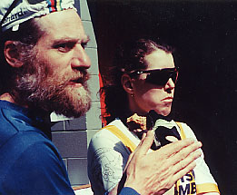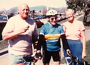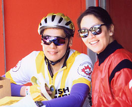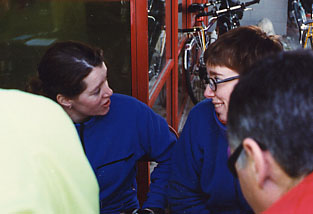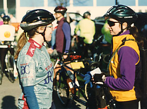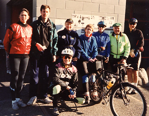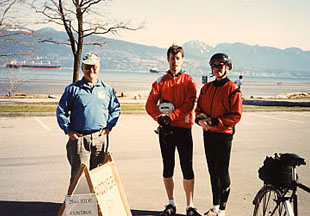 | Dan McGuire (left) at the Spanish Banks control with Ian and Lorraine Faris. | Bruce Hainer was at Woodward's Landing control. Karen Smith was on the sign-up desk and was in charge of pin production. | Hugh and Florida Town (far left and right) were at Woodward's Landing control. |