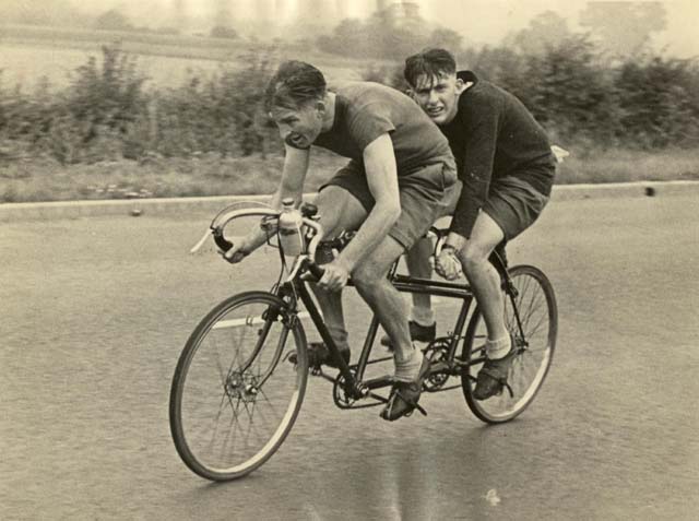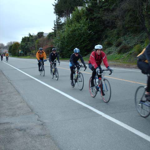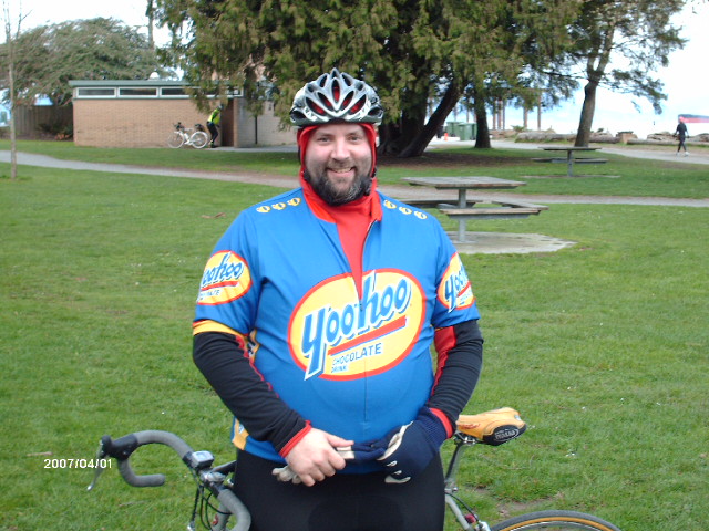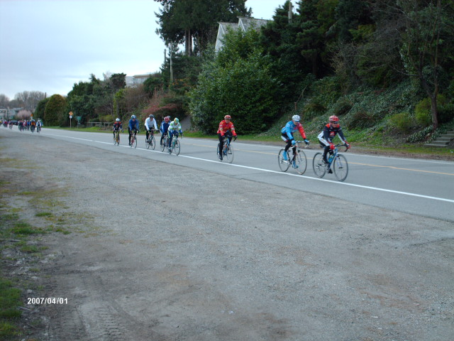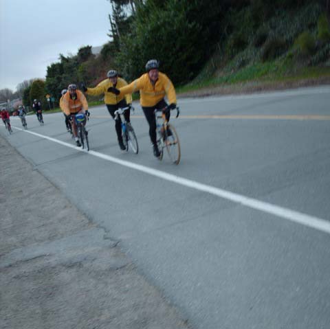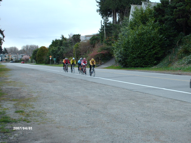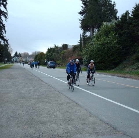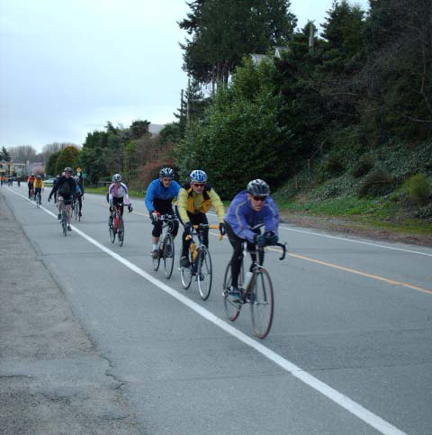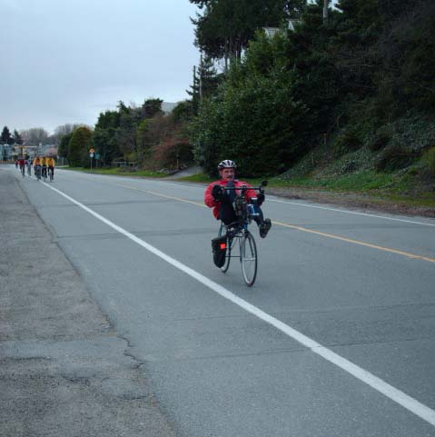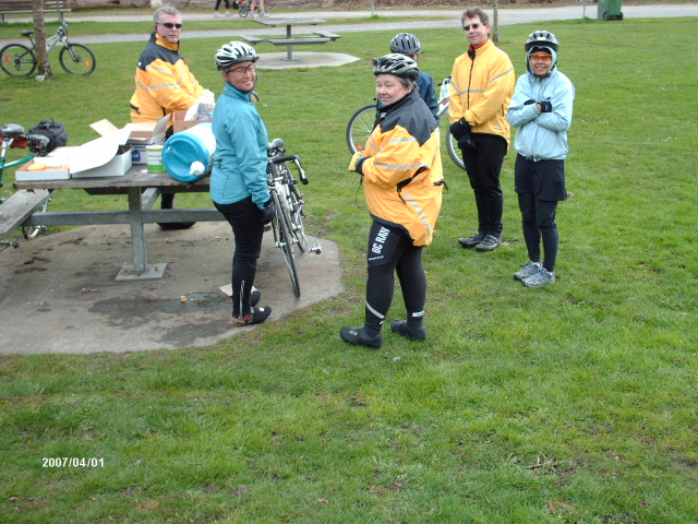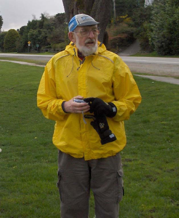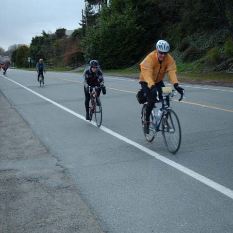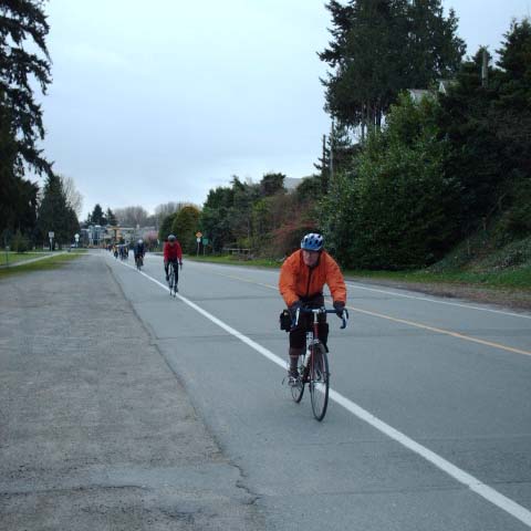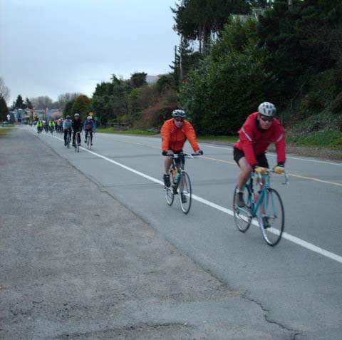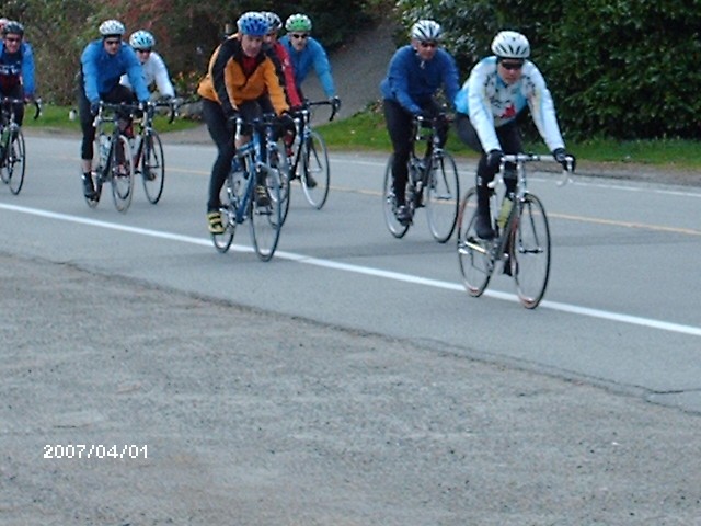 The photographer of these photos (above) is long-time randonneur Harold Bridge, who took many of the photos along Pacific Populaire routes in the mid/late 1990s. He was a time-trialist when he lived in England, though I hadn't realized that he tandem tt-ed until I received this first photo (below) today. In the photo, Peter Bury is up front, Harold's the stoker. In Harold's own words: "Tandem time trialling 1949 style - 100 miles - 4-4-57. Taken about 5 miles from the finish. My snarl is due to the photographer shouting; "Number?" and me giving it to him. The record that lasted a year. With another partner on the same tandem I did 4-4-42 in 1950." Harold also designed the Three Hump Camel 200 km route coming up on April 14, and he pre-rode and route-checked the course. The second photo below is from Harold's 200 km pre-ride. The third photo below is a photo of Harold at the Spanish Banks control, on April 1, taken by Philip Neuwirth. [Eric F] |