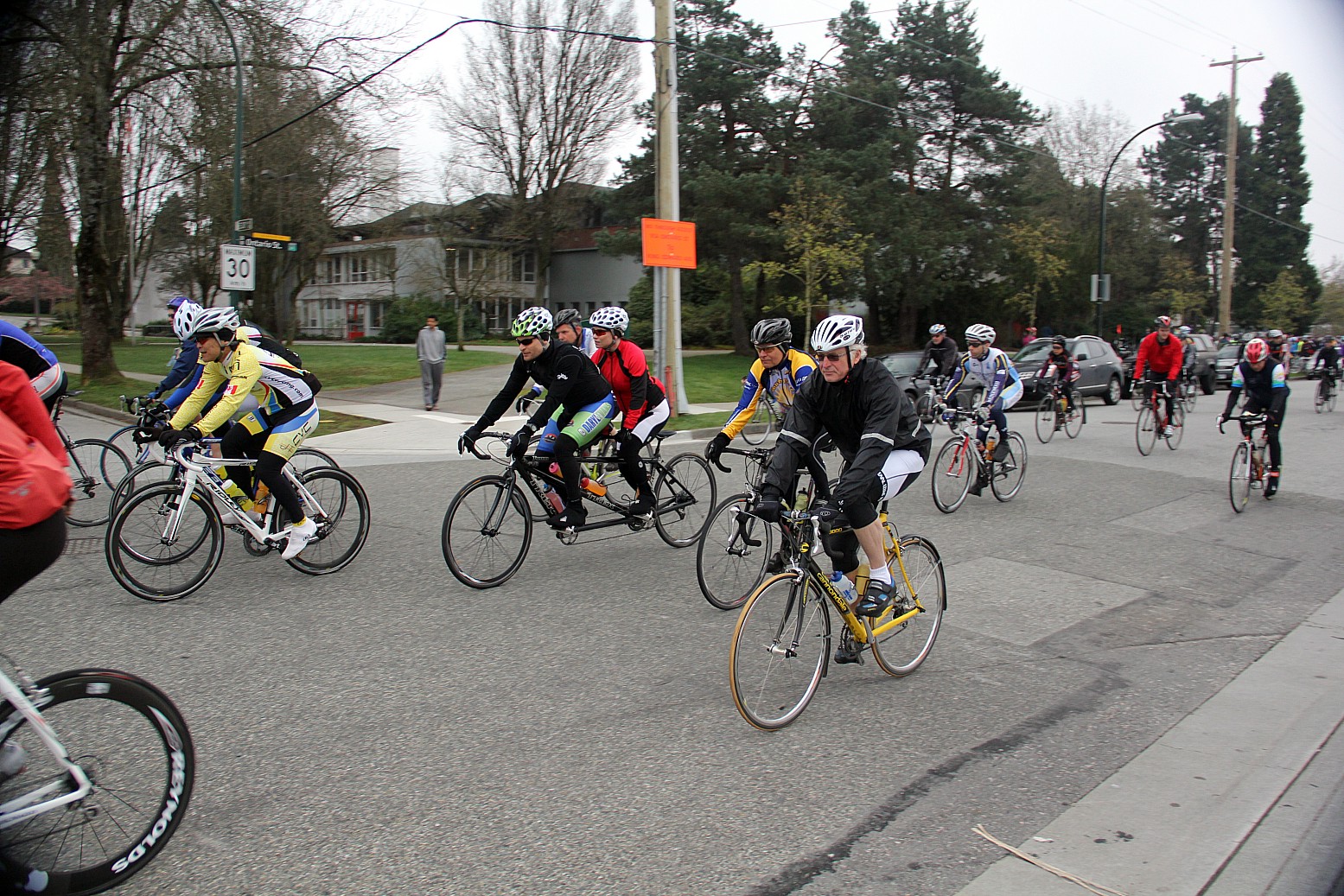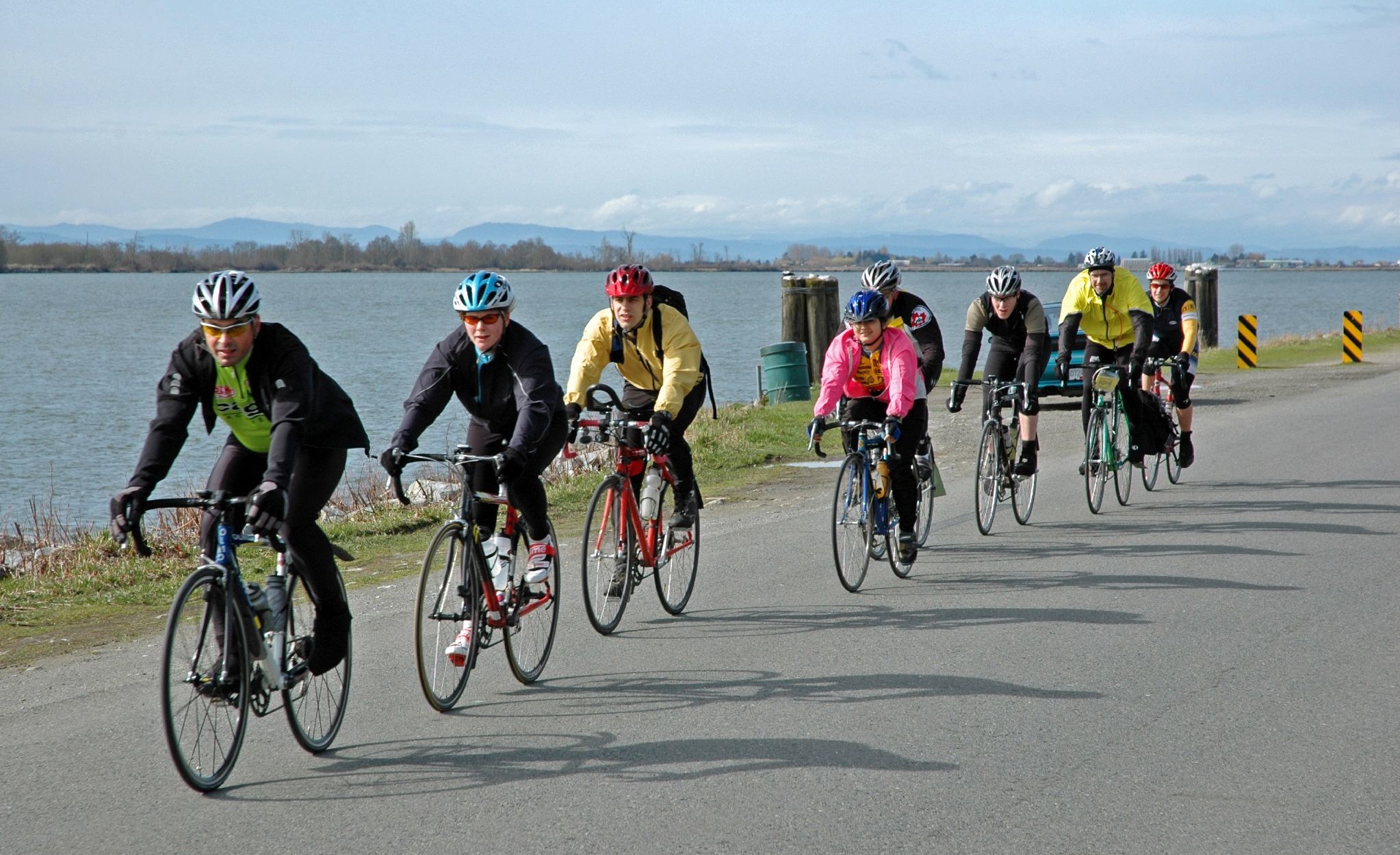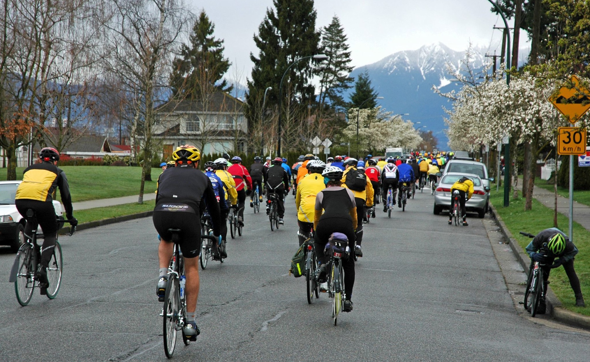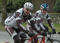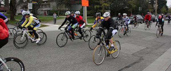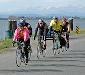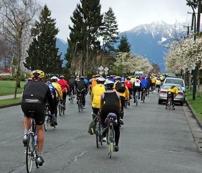 What is the Pacific Populaire Bike Ride? Greater Vancouver's first major public ride of the cycling season is the Pacific Populaire. Since its inception in 1986 the focus of this event has been to encourage participation by all cyclists regardless of fitness level, cycling experience, or age. For many riders it is an opportunity to enjoy a relaxed spring ride, fresh air, and exercise in the company of other riders in our vibrant cycling community. The event is also an introduction to the sport of randonneur cycling, where the rides called "brevets" (200 km+) are non-competitive in nature often characterized by cooperation and camaraderie between riders. Road safety is the primary concern for randonneurs. No roads are closed for the Pacific Popularie or any other randonneur event. Participants must share the road with motorists, watch for pedestrians, and obey all traffic rules. Riders who engage in racing or other unsafe riding practices will be disqualified. In accordance with BC law, all cyclists must wear approved helmets at all times during the ride. Your bike should be in good working order. For details on registration, go to the Registration Page. The starts for the various distances will be a few minutes apart, starting with the 100 km leaving at 9 a.m. sharp. The start is on Ontario Street. The usual randonneur equipment rules and practices have been relaxed for this event - fenders and lights are optional. However, reflective clothing and rear lights are recommended - they will help make you more visible to motorists if it rains. Randonneur time limits also will not apply, so take your time if you have to. Participants under 19 must be accompanied by a parent or guardian throughout the ride, or another adult designated by the participant's parent or guardian. The routes all make their way to 'control stops' where riders must have their control cards stamped and signed by a ride official. Food and drink is provided at the control stops, and at the finish if supplies last. At the end of the ride, the rider turns in the control card, and is awarded a finisher's pin. |