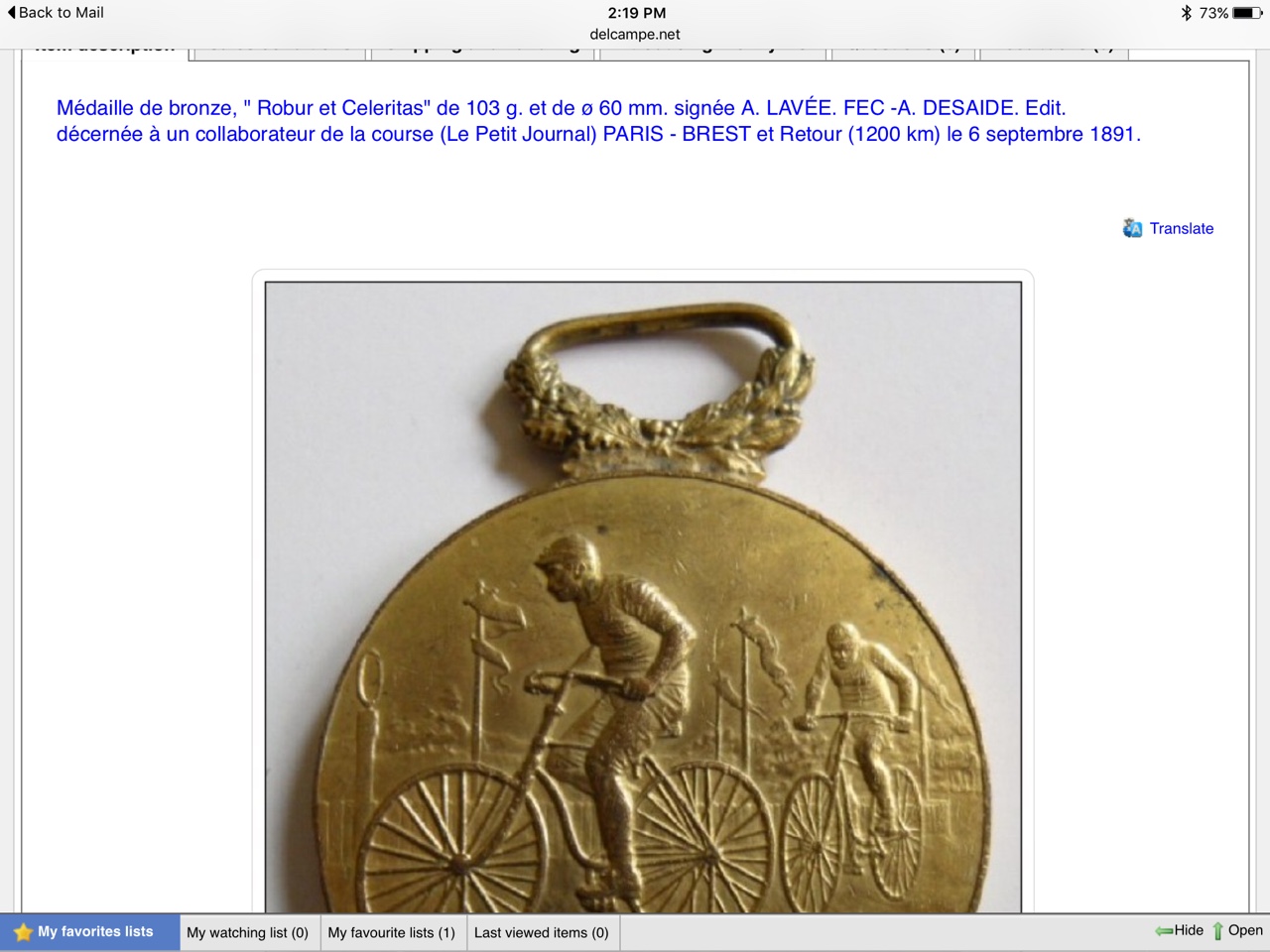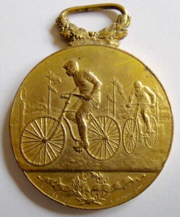 (Race) Special thanks to John Campbell for this image. This bronze medallion may be a participation or finishers medal from the 1891 PBP race. The latin motto "Robur et Celeritas" means "strength and speed". You will notice that there is no direct reference to Paris Brest on the medal. The delcampe.net web site claims on one page that this is a Paris Brest et Retour medal, but in the two other versions of the medal I found when searching on the motto there is no reference to Paris Brest. The other 1891 medal in this section is far more likely to be the offical medal, but this one remains a curiosity. Explanation on delcampe.net |