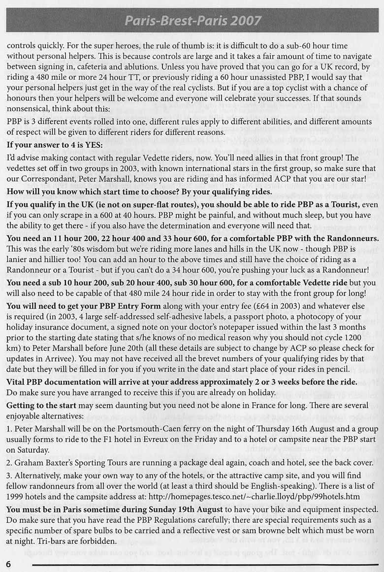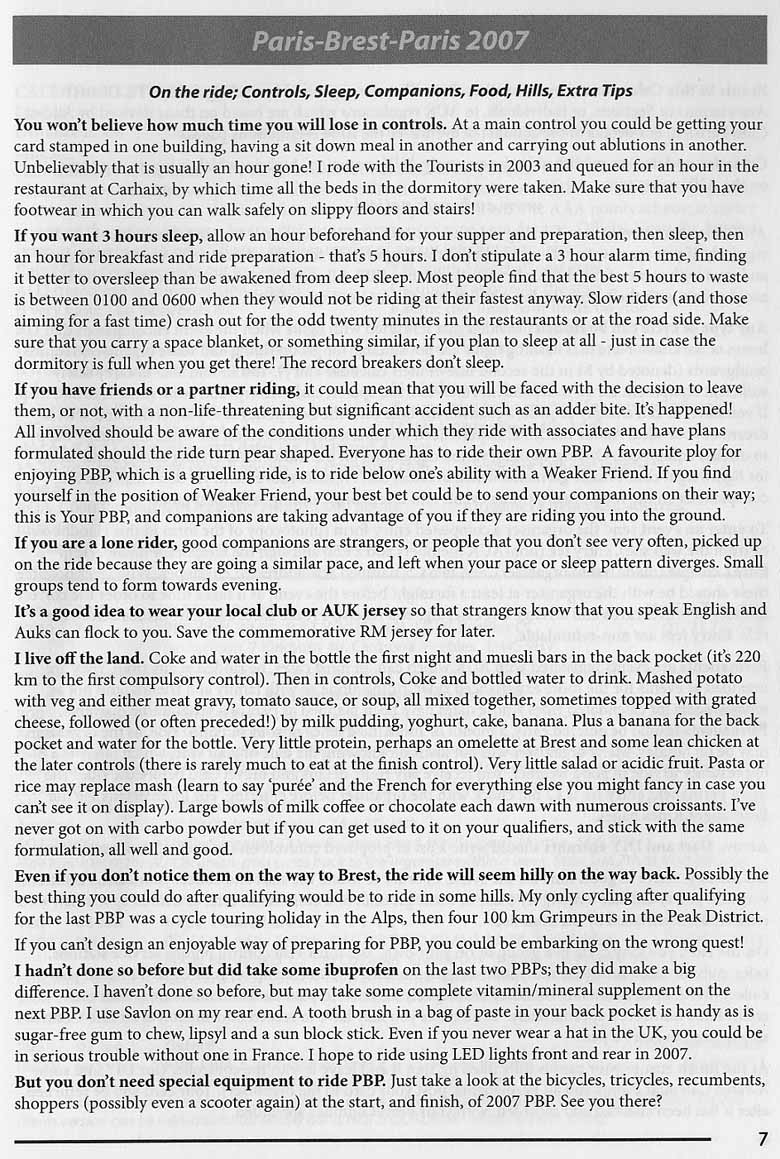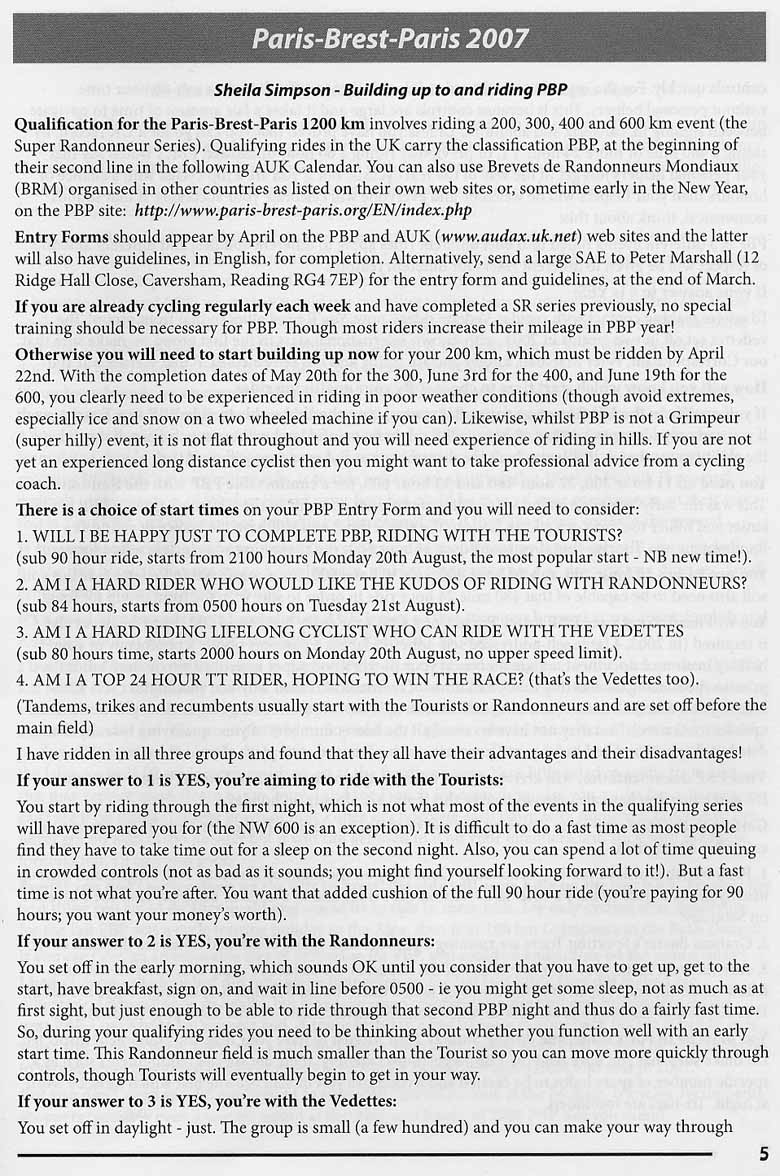 Sheila Simpson is an experienced and knowledgeable randonneur (...randonneuse) from the UK. She edits the Audax UK annual handbook. The document below is from the 2007 edition of that handbook. When Sheila talks, people listen. You will find her thoughts on PBP preparation and event riding helpful: