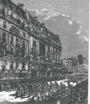 Le départ devant l'hôtel du Petit-Journal (Journal illustré)