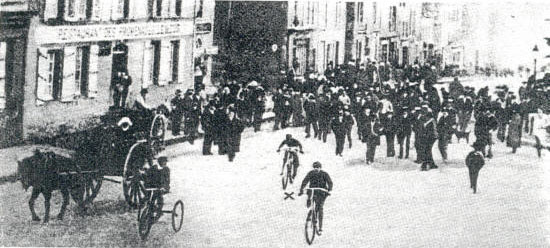 Terront (x) arrive à St Brieuc, entraîné par Picemin (à g.) et Chevalier (à d.) (Miroir des Sports)