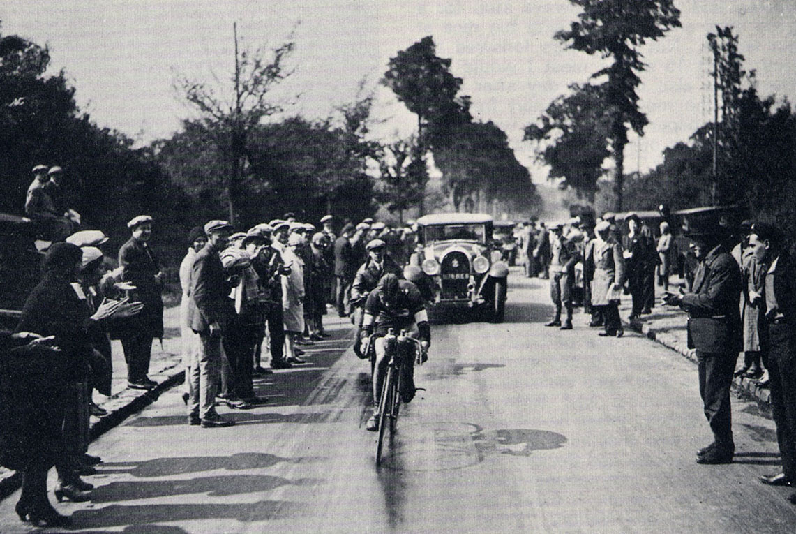 This photo is from page 11 of J.B. Wadley's 1972 collection Old Roads and New, in the chapter on cycling journalist Rene de Latour. Latour was a friend of, and frequently translator for Oppy. There is no photo credit for this image and no source indicated. The caption below is Wadley's: Three years later [after Oppy's 1st major road race in Europe - Paris-Brussels, he placed 3rd] and now an established and popular star after couragous rides in the Tour de France, "Oppy" breaks away in the closing stages of the decennial Paris-Brest-Paris 750 miles marathon. He will be caught by a small group but [is] still strong enough to out sprint them on the final straight of the Velodrome Buffalo. |