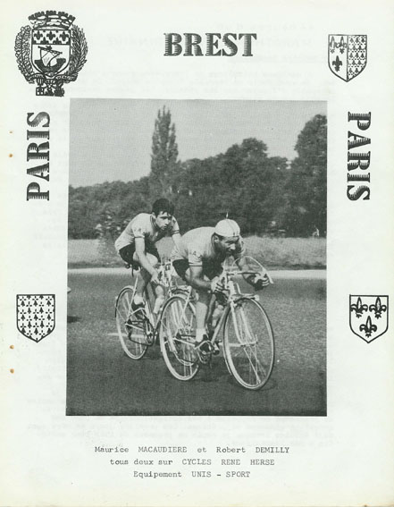 This is the cover of the Union des Audax Français newsletter from January 1967 in which the Maurice Macaudière's article (linkded below) appears. The picture features the winners - Maurice Macaudière, and behind him, Robert Demilly. The picture is from the final stage of PBP, between Dreux and Paris. No photographer is credited in the newsletter. Thanks to Jean Richard who provided this image. In passing, Jean mentioned a few additional tid-bits about the cover: "By the way (I had absolutely forgotten this detail), the design of the page was my work, with the armorials of both cities, Paris and Brest, on the top, and those of the Dukedom of Britanny, respectively the County of Paris on the bottom. Bernard Déon has made use of the picture in his book with the mention: "Photo Miroir du Cyclisme" (a specialized French cycling review) ." (Go to: Maurice Macaudière's "44 heures d'un marathon extraordinaire") |