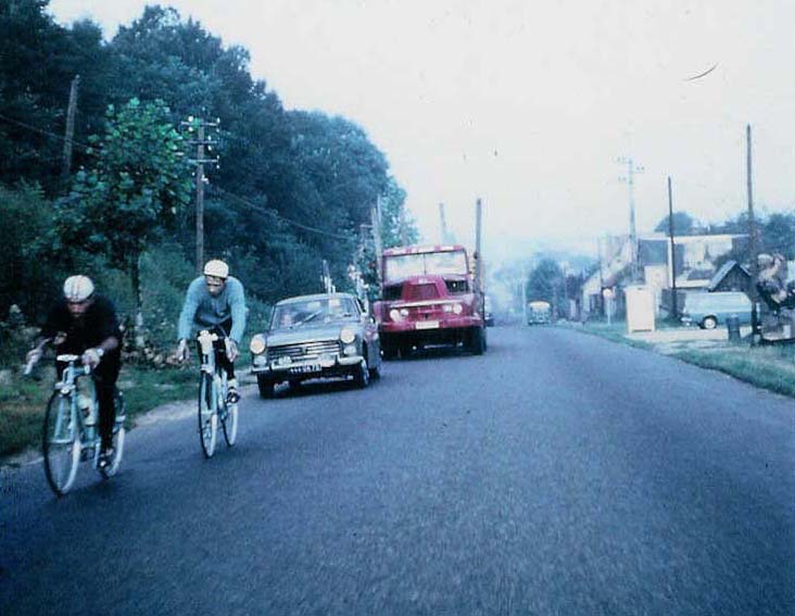 September 09th, 1966, early in the morning. Between Mortagne-au-Perche and Dreux, the two future winners, Maurice Macaudière and Robert Demilly, followed by the "404" driven alternately by René Herse and his daughter Lyli. All in the team, are giving the order to reach Paris as soon as possible. (Caption by Jean Richard) |
