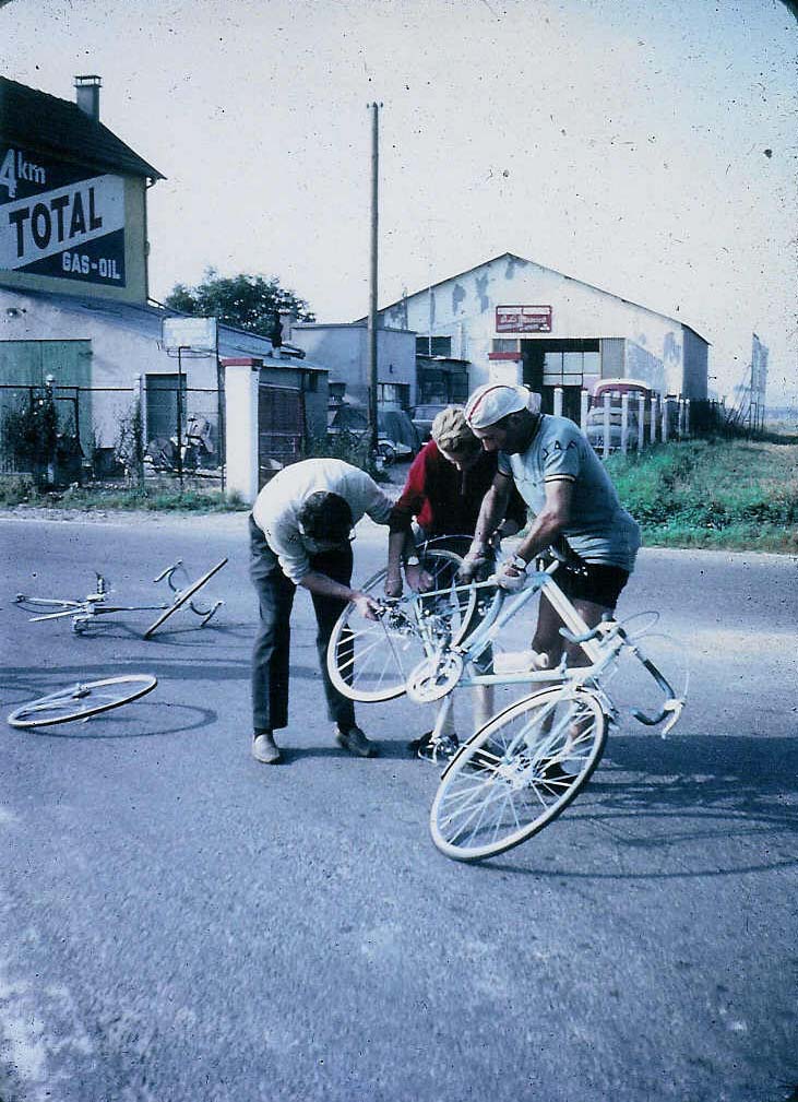 Between Dreux and Paris, the rear wheel of Maurice Macaudière's bicycle had to be changed. Lily and René Herse are helping.