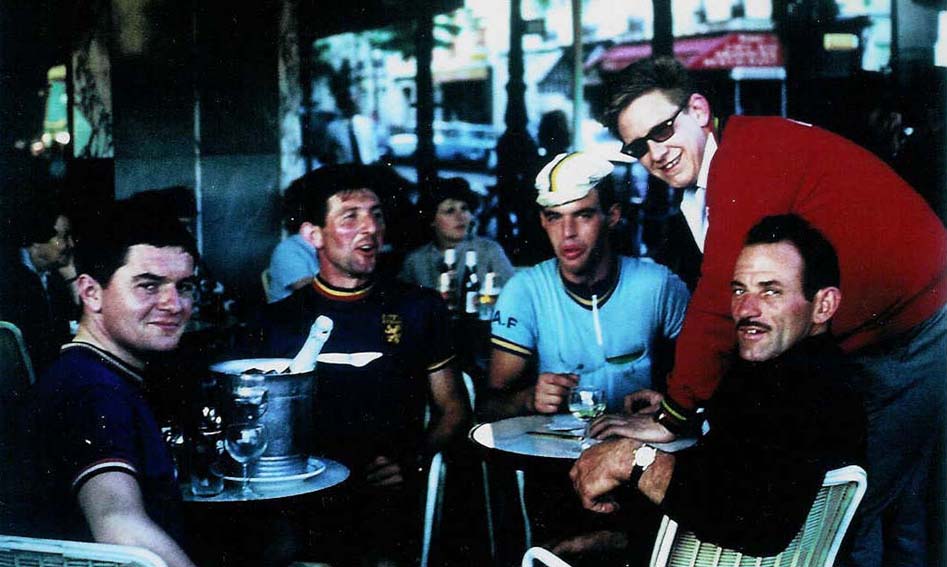 The late Alain Gicquel (1944-1999) wearing the light blue jersey of the U.A.F., celebrates the successful participation to PBP Audax together with two Belgian participants and their helpers, around a Champagne bottle.