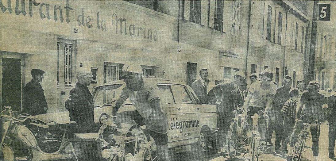 | Picture 5 shows the four leaders leaving the check-point in Brest. From left to right, Maurice macaudière is mounting on his bicycle, Serge Veau is still standing in the street, and puts something in his jersey pockets, Robert Demilly starts, as well as André Triolet. |