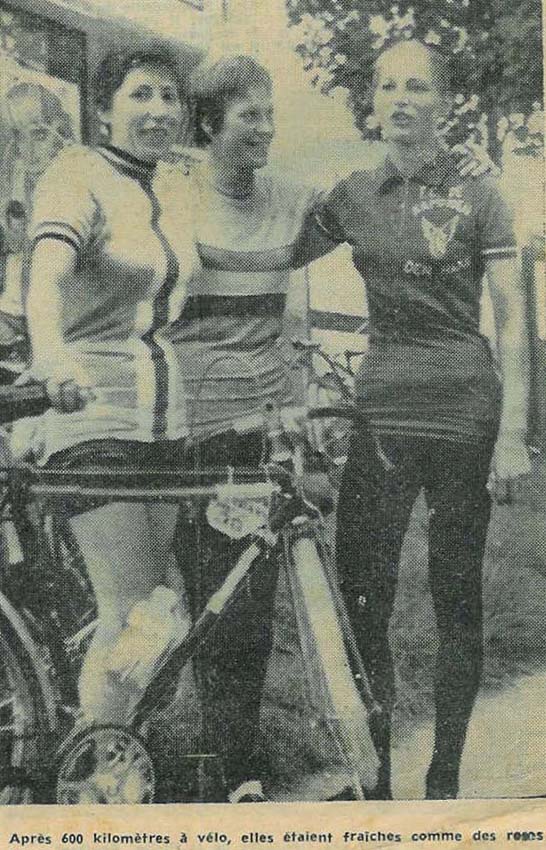 ...The second picture shows three ladies. Christiane Neumann (Belgium) is wearing a jersey with vertical stripes (designed for the cycling association of Uccle, a southerly suburb of Brussels). The two other ladies are from the Netherlands - Mrs. Dreuning and Mrs. Gieselbach (but I do not know who is who). The smaller of them, in the middle, is wearing a jersey with the national colours of her country, the other one has a dark red jersey. I have known Christiane very well. She was married to a German husband living in Belgium. Some years later, she was married again, this time to Bernard Guillemin (first picture) until his death (he was killed on his bicycle by a car coming out of the fog), and later on she married Louis Bonny (the leader at the turn in PBP randonneurs 1971).