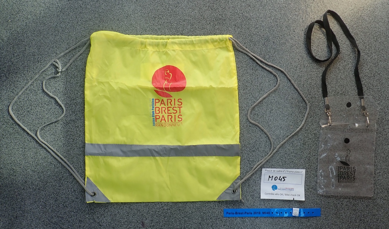 | The ride package came in this yellow bag. The bag is also a back pack. I was surprised to see some riders using the bag during the ride. The blue wrist band was for rider identification for bike security. The clear bag with straps is of course the control booklet holder. Click HERE to enlarge image. |