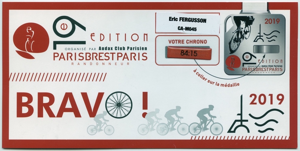 | This was new for PBP 2019. In the past we received our finishers medal in a follow package some time after the event. The medal had our finishing time engrave on it. In 2019 we received our medal at the finish control. Obviously the time was not on the medal. Months after the event we received this card in the mail encouraging us to have our times engraved on the medal. Click HERE to enlarge image. |