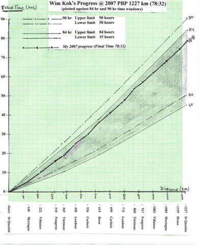 past. Comparing PBP 2007 with 2003 left me with a few observations. First I slept about 6 hours, as little or as much depending on how one looks at it. My three sleep breaks straddled the midnights, depending on when I arrived at the control. The nights themselves seemed longer, certainly darker. While there were some slow sections, I did not experience any low points like in 2003. Food wise, I ate mainly at the controls, although I could have eaten more on the road while cycling. For me there is still room for fine tuning in this department. Clothing wise I cycled mainly in tights. Cold and wet conditions were therefore less of an issue. The long sleeved Merino wool jersey, even when wet kept me comfortably warm. That multi-functional tubular wear kept the neck and head warm. Under my helmet I wore the FFCT cycling cap, which diverted the rain and dripping 'head' waters. It also shielded my eyes from the headlights of oncoming cars. I used the rain jacket/pants quite a bit, although under drizzly conditions the wool jersey shirt was sufficient to keep me warm, even while wet. I wore heavy woollen socks - not the most elegant summer wear -- but they did the trick of keeping my feet warm. Equipment wise, I used the same bicycle as 4 years ago, equipped with 700 x 23C tires at 115 psi (Hutchinson Fusion on the rear; Stelvio on the front). Not a single flat. Fenders and two panniers stuffed with the necessities of life. I used a helmet lamp and two Cateye EL 530 lights. These worked fine most the time, although under dark and cloudy conditions they created a bit of a light tunnel effect (Note: not the light at the end of the tunnel effect). Physically, I suffered no ill effects from the ride; no tingling hands or saddle sores. Table 1 displays my 2003 and 2007 arrival times. It also shows the 2007 closing times and the 2007 time buffer at each of the controls. My 2007 arrival times are remarkably close to those from 2003. The biggest difference occurred when I hit Mortagne-au-Perche on the way back. I was about 3 hours faster. In 2003 I encountered a near meltdown, which was more due to nutrition management, or lack thereof in the previous hours, than any road or weather conditions. The increased buffer gave a chance to 'enjoy' almost two hours of sleep at Mortagne. Overall, I was nearly one hour faster than 2003. Table 1: Comparing Arrival Times 2003 and 2007 * Control Distance Arrival Arrival Closing Buffer