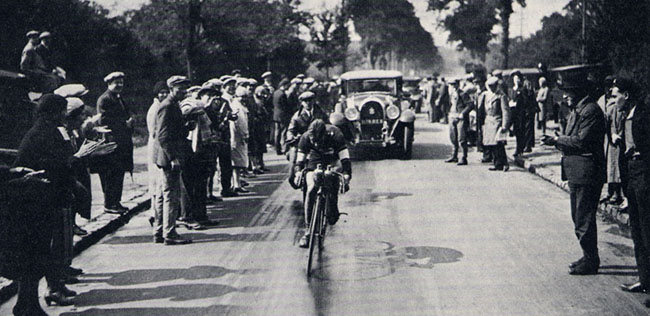 Decroix led Louyet as the faintly heard bell sounded the last lap. Bidot jockeyed for the desirable third position - Pancera watched from fourth, and taking no chances of a fall, I trailed last. The tempo quickened, Decroix was at top speed with four hundred yards to cover. At three hundred yards Louyet left his wheel and went past, and it appeared that the Belgian must win, when Pancera shifted madly and rushed alongside. As he did it gave me my chance, and from three high on the steep bank I had a marvellous swoop into the straight to a ten lengths win, and the pinnacle competitive victory of my life. |