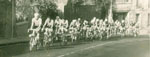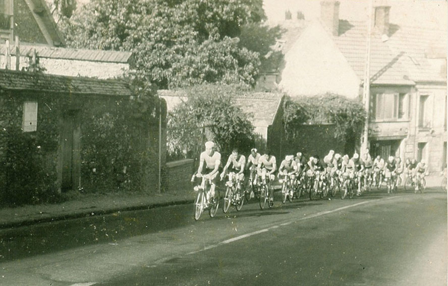 Four members of the U.A.F. (known as the "Blue Train", because of their sky-blue jerseys) are leading the party: Jean Richard, then Rolland Bailly, Robert Demilly and Maurice Macaudière respectively. Between Rolland and Robert, on the right side of the road, the high silhouette of Roger Baumann (wearing a two-coloured cap) can be seen. The rider with dark hair and jersey following Maurice is Serge Veau. Nearly 20 riders are still together, and at the right margin of the picture, the first rider (or at least the front wheel of his bicycle) of a second group can only just be distinguished, at a distance of some 10 meters behind the last riders of the first group. This slight disconnection has been irrevocable for the riders of the second group, who should never see those being in the first one again, except maybe after the turn in Brest, as the better placed riders were already on the way back to Paris