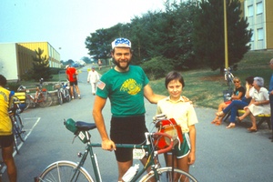 But riding through a sunny afternoon with my new friends we talk about anything in our abilities to speak and understand the other's language. During supper at the Carhaix-Plouguer checkpoint we are joined by four others looking for night riding company: Canadian Hans Breuker, and three Americans, one from St. Louis (whose name is lost in the fog of sleep deprivation), and Steve Bales and Hubert Hawley, two amiable, if uncharacteristically small, Texans. As we roll out of town, the second night of PBP '83 engulfs us, and my few remaining interactive brain cells rummage for tricks for staying awake. I reflect on Charles Bowden's inspiring story of the 1982 Arizona Bicycle Challenge but I’m no longer inspired. I consider, as he did, that my bike’s chain contains 500 parts working in harmony and wish that my mind and body had such harmony. What ultimately keeps me going is the memory of my stateside sendoff party. I sense that all those cycling friends, and Mom and Dad, are all beaming energy across the pond to me. Now I'm riding for them, and for the honor of the ‘Greasy Gonzos’ club T shirt I wear.