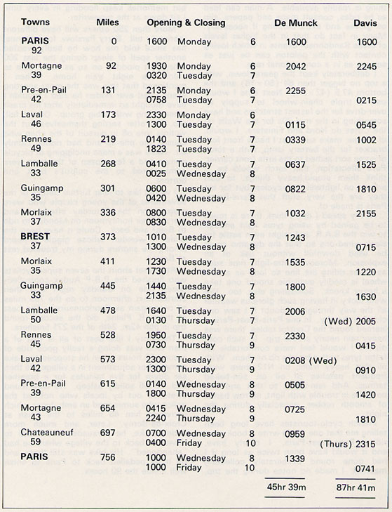| Readers making an assessment of their own capabilities over the route will be helped by the details given on the facing page [above]. Intermediate distances are shown between the Control towns. The last two columns are the arrival times of the fastest rider Herman De Munck who was off his unencumbered bicycle for no more than an hour all told, and of 53 year old George Davis of the C.T.C. who trundled a very heavily laden machine to win exactly the same medal as the Belgian. George spent about 17 hours eating and resting at Controls. |