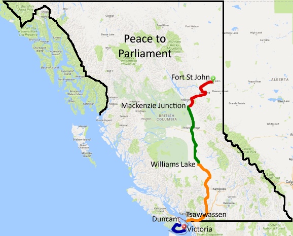 The Peace to Parliament is a first-of-its kind event for British Columbia. It is an opportunity not only to earn a Super Randonneur medal in a single week, but also to earn the BC Randonneurs' Rambling Randonneur pin for riding a brevet in each of the club's regions. It may be your last chance to see the beautiful Peace River Valley before the Site C Dam floods it. The event is being run as four separate brevets, with very little support. There are highways without shoulders, stretches of nearly 100 km without services, stretches over 100 km without telephone coverage, night riding in the Fraser Canyon and nearly 15 km of climbing. There will be no sweep riders or sag wagon. If you DNF, it will be up to you to get yourself home or to the next start. Club rules require that a rider must have ridden a 200-km ACP brevet before riding a 300, a 300 before a 400, and a 400 before a 600. This rule will not be waived for this event. You can ride any combination from one to four of these brevets. They are just four separate brevets, with normal rules and fees. We hope that a good-sized flock of Vancouver Island riders will join us on the final leg. You should sign up on the Randopony for each leg: