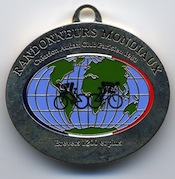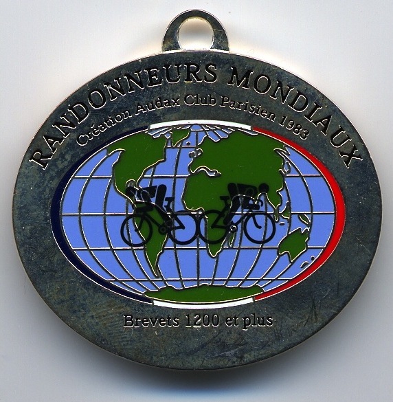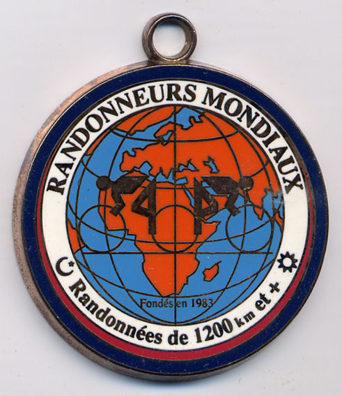 Randonneur Mondiaux medals are awarded for the completion of a 1200k Grand Randonneé (or more). The first one (on the left) was designed by Jennifer Wise, from the USA, RM President 1995-1999. The second one (on the right) was designed by Hans Dusink, from Australia, RM President 2003-2007.