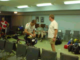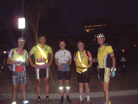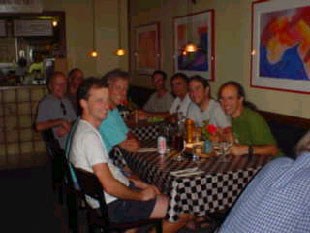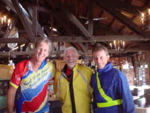 1200 Tour 2002 In the beginning of 2002 I planned to go second time for BMB but when I learned from friends that they are going for RM1200 I changed my mind. After a few e-mails with Danelle Laidlow (she organizes the RM1200) I get the permission to start and my boss confirmed my vacation request. Because of my late decision to fly to Canada I only get a business-ticket, so I have to use all my German Lufthansa bonus-miles. Therefore I fly from Cologne via Frankfurt to Vancouver and with AirCanada to Kamloops. On the way back I can fly to Duesseldorf. After I get myself ready for the 1200k through the Canadian Rockies with several brevets in Germany, Belgium, France and UK, the 8-day ride Paris-Nice and the "Jotunheimen-Rundt" in Norway I drive with a friend on Sunday, 21. to Cologne airport and check in. The short flight to Frankfurt is just up in the sky and down again. From Frankfurt I fly in a B747 Jumbo-jet. Luckily I sit in the first row and enjoy a calm flight. While approaching Vancouver my seat-neighbour (he is from here) offered me his window-seat and explained Vancouver a little. Shortly after landing the luggage arrives and not long after that my bike box also arrives. The immigration procedure takes only a few minutes and since I have three hours to spend I visit the AirCanada lounge, take a shower and eat a little. During the flight to Kamloops, operated with a small propeller plane, I can enjoy the wonderful scenery of the mountains below us. The first thing I register in Kamloops is the high temperature of 31°C at 6:30pm. The luggage from the few travellers arrives within minutes after landing and with my bike box and my travel bag I find immediately a taxi to downtown Kamloops. Arriving at the motel I only check-in, bring everything to the room, eat something and fall asleep after a 22hour journey. The next morning, after having breakfast in the restaurant next to the Motel, I assemble my bike. While doing that I feel the rising temperature, of which I have heard in the weather forecast. Afterward I start to a first test ride. With the town-map handy I ride to the Visitor-Info and realize that Kamloops is not flat but has some steep ascents of 8-10%. After I bought some postcards and in the shopping mall next door some stamps and souvenirs I easily ride 65kph on the way down to the Thompson-River. I spend a few hours strolling through town but afterwards I have to climb up the hill to the motel. There I use the pool, which is a good choice at this temperature. Tuesday morning after breakfast I set out on a trip to find the "Balancing Rock" which I saw on a postcard. The first hurdle on the way out is a roadwork unusable for cyclists due to a no longer existing road. The following bike-path guide parallel to the highway until it goes onto the highway. First stop this morning is the viewpoint over the lake Kamloops. A few kilometers later I reach Savona and ask at a gas station for the "Balancing Rock". I'm told that it's somewhere between Savona and the viewpoint I passed on my way to Savona. So I ride back to the viewpoint but cannot find any sign. I decide to ask someone else but they are tourist and don't know the area well. It's lunchtime and I decide to stay for a while, eat and drink something and read my book. I have just decided to go back to Kamloops when another rider appears from Savona. He asks for my direction and as we are heading both to Kamloops we ride together. On the first downhill part I pull my brakes permanent and he is pedalling all the time until I release the brakes and run away. Climbing the next hill he is back again and we start chatting. It's Kent Petersen, he comes from Seattle by bike to take also part in RM1200. We stop at a gas station for quenching our thirst with some cool drinks. While sitting in the shade I look a little bit closer on his bike and be astonished about his "fixed gear" bike (one gear, no freewheel). That's the reason why he was permanent pedalling downhill, while I rushed easily away. We ride to Kamloops together and Kent take a room at the same motel. Peter Noris from Florida arrives with the other guys from Seattle while I'm sitting at the pool. I met him last year at BMB and this year we share a room at the Sagebrush-Motel. At the evening we have dinner with the guys from Seattle in downtown Kamloops. Dinner with the guys from Seattle Wednesday morning Peter and I start for a tour towards Savona but that day we find a way around the roadwork area I found the day before. On the way back we meet a touring-biker, which we accompany. Due to a flat tire on Peters bike we have to stop again and change the tire. After returning to the motel and having lunch we pack our drop bags. Everything else we pack in my bike box and give it to the reception desk. Peter takes a nap but I cannot, perhaps I'm too nervous although this is my third 1200k ride. At around 7pm we check out and ride with our drop bags downtown to Peter's Pizza where we meet some other riders. Registration and bike inspection starts at 8pm at Heritage House in Riverside Park. It takes only a few minutes and so we spend the rest of the time until 10pm with strolling around, talking with other riders and taking some pictures.