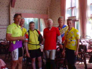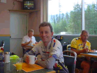 We start after last minute instructions at 10pm with a very slow pace. I'm astonished, I thought it starts like a race as it was in Paris 1999. Nevertheless, during the next hours I loose contact to the group and cycle by myself. Sometime during the night my headlight breaks, the bulb is burned. I know the problem from BMB last year, so I just swap the bulb with a spare one and can go on. It is very warm during the night, I ride with my short-sleeved jersey but my water bottles run dry, so I am happy to reach the first checkpoint. By about 3:30 in the morning after 133k I reach the 1st Checkpoint in Clearwater. In front of "The Windmill Bed & Breakfast" I get some sandwiches, drink some cups of ´Gatorade´ and refill my water bottles. While sun rises tiredness comes to me. I think I fall asleep one my bike for a few seconds or so and I'm happy as another cyclist catch up with me. It is Wim Kok from Fort St. John and we start an interesting conversation, which kills my fatigue. On the way from Avola to Messiter Summit we pass a roadwork and have to pay attention to the road, as there is a lot of gravel on it. Endless appearing kilometer later, on which we swallow a lot of dust, which is swirled up by roadwork vehicles, we come to the 2nd Checkpoint in Blue River at km 229. We quickly check in and disappear instantly in the Husky Service Station to escape the hostile mosquitos. During the good breakfast we meet some other riders. After the enlarged break we go out again. We rush to get on the bikes to escape the mosquito harassment. Breakfast in Blue River Husky Service Station We reach another summit and stop for a pee but continue soon because the mosquitos are very aggressive. After 339k we reach the 3rd Checkpoint in Tete Jaune Cache at 2:45. Meanwhile it get warm again and the volunteers move with their table into the shade. We have a good chicken-noodle soup at the restaurant to power up for the next stage. I wash my arms and legs refresh my sunscreen then we go on again. Suddenly my back wheel lurch and I find a flat tire. I tell it to Wim and we stop at a parking space. I get my tools and a spare tube, take the wheel off and change the tube. Wim detects a tiny little piece of wire in the tyre. We guess it was from a shredded truck tire. At the Mount-Robson-National-Park we have to pay a fee of $CDN 3.00 but now we can stay until the next day 4pm at the national parks. We meet Barb Henninger and Ron Himschoot and ride together towards Jasper. We can't find the Yellowhead Pass. There is no ascent for a while but we also don't see a sign for the summit. At about 8:45pm after 443k we reach the 4th Checkpoint in Jasper. We find our first drop-bag with new clothes, towel and shower gel. I get a notice from Peter at the check-in. He made a room reservation at a hotel nearby. There we try to change the room from a 2-bed to a 3-bed room to get Wim also in. It's no problem, so I ride back to the checkpoint to get Wim but can't find him so I leave him a message at his things. Previous to having an absolutely necessary shower I eat the pizza Peter brought for me. After the refreshing shower I go to sleep but at 2am the alarm clock ring merciless. We check out and ride to the checkpoint for breakfast. I make out Foster Renwick, a friend from BMB last year, which is sleeping in the dark corridor. I point with my finger in his direction but Peter misunderstood this and flung his drop bag on him. Foster, who arrived two hours behind us, wakes up but makes "good face to bad games" and decide to come with us after breakfast. However in some way Foster disappear and so we start without him at 3:15. In addition to the chilly morning it starts to rain after a while. In the cloudy first light of the day we see a female deer with her young quiet standing at the side of the road, our only encounter of "wildlife" on the tour except a few ground squirrels. 56k later we reach Sunwapta Falls restaurant and stop for another breakfast. I give my unused windbreaker to Peter to warm up a little bit since he carries no warm clothes. It's not his size but for the moment it's OK. We sit at the fireside and Peter can persuade the waitress to make a fire. It didn't help much since the firewood burnt out quickly and the room is huge. Breakfast in Sunwapta Falls Restaurant On the remaining 49k uphill the sun come out. The last few kilometers into Columbia Icefield Center at 548k are stretching out like chewing gum and in the end I'm searching for the entrance to the parking lot and the 5th Checkpoint in the Icefield Center. After checking in we go to the restaurant to eat something. It's cold there since all windows are open on a mysterious reason. As we are heading off my front wheel lurch and I detect the second flat tire on the tour. At the inspection again we find a tiny little piece of wire as reason for this defect. So I change the tube quickly and we can go on towards Sunwapta Pass. We climb up the steepest part at walking speed before it goes slightly downhill to go uphill to the 2035m high Sunwapta Pass again. I achieve a new top speed of about 82.7kph on the descent that could have been higher if I haven't looked on the speedometer at that pace. The try to stop at this speed at a parking lot to take some pictures succeed shortly before the end of it. I take a picture and zoom down again to catch Wim. Peter shows me his speedometer afterwards, which shows 108kph as maximum speed. This is without a doubt the reason that Wim and I see him again at the next checkpoint. On the way to the Bow Pass another rider overtake and I ride for a while with him before I let fall me behind him to cycle again with Wim. With a cold wind blowing against us from the pass we reach the 2065m high Bow Pass late in the afternoon. We pull over our windbreaker to not feel the cold downhill. After 676k we reach the 6th Checkpoint in Lake Louise. At the Recreation Center we take some refreshments while at Peter's bike the gearshift wheel
