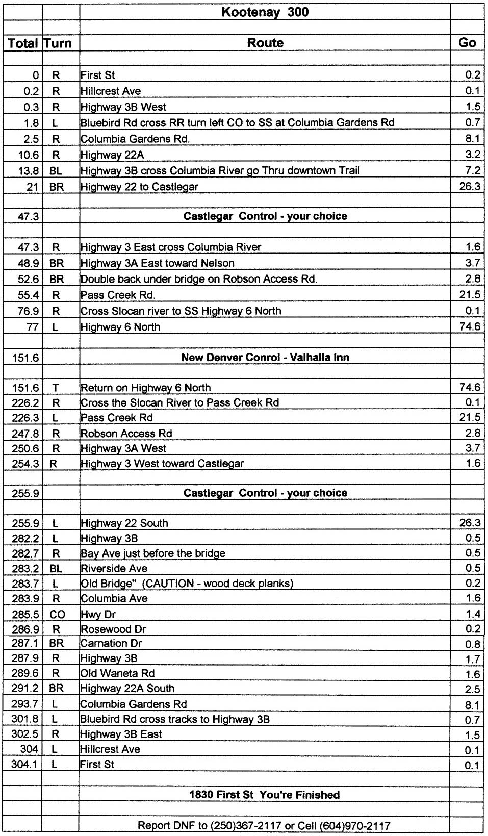 West Kootenay 300 km July 1, 6 a.m. (Gord's place - 1830 First Street, Fruitvale) |