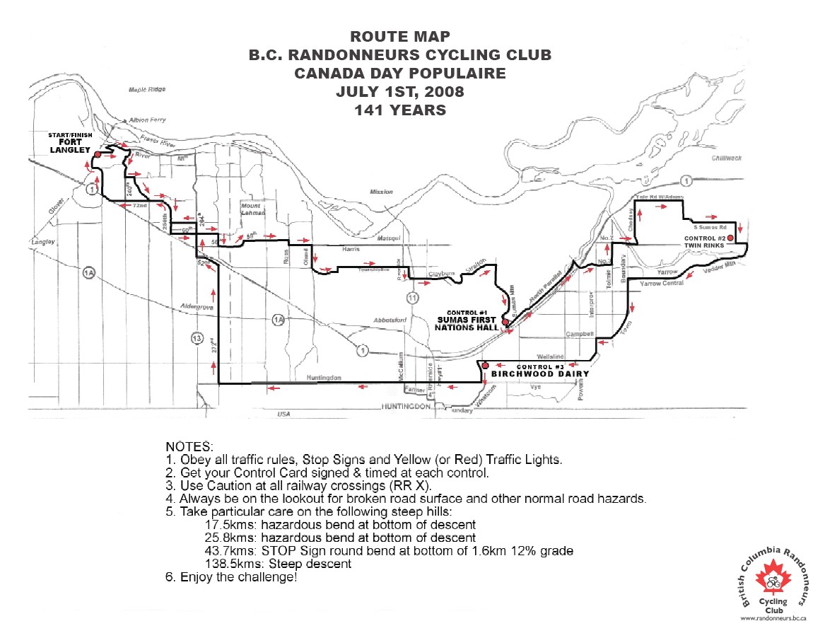 Go to: CanPop Home Canada Day 141 Populaire 141 km for 141 years Tuesday, July 1 Ali Holt & Roger Holt Start/Finish: Fort Langley Lions Hall (Corner of Glover Road & 88th) ![]() Route Map (Click) ![]() Route Profile |