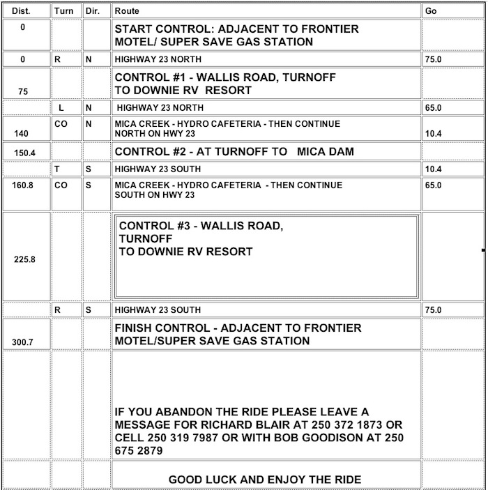 Start / Finish: Revelstoke: Adjacent to Frontier Motel / Super Save Stn., North East corner of intersection of Hwy #23 North and TCHY #1