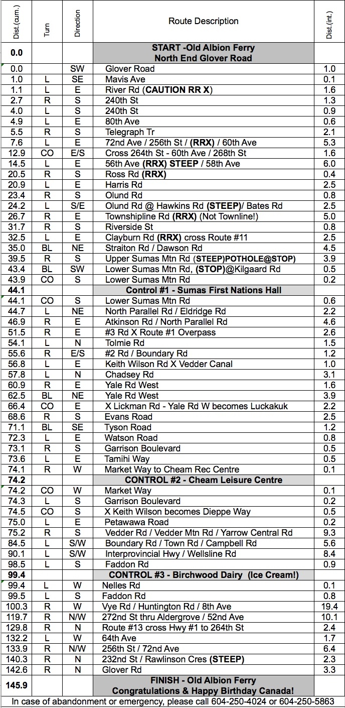 Rides Roger Holt & Ali Holt 604-946-8438 Start Time: 8:00 - 9:00 a.m Route Sheet Map |