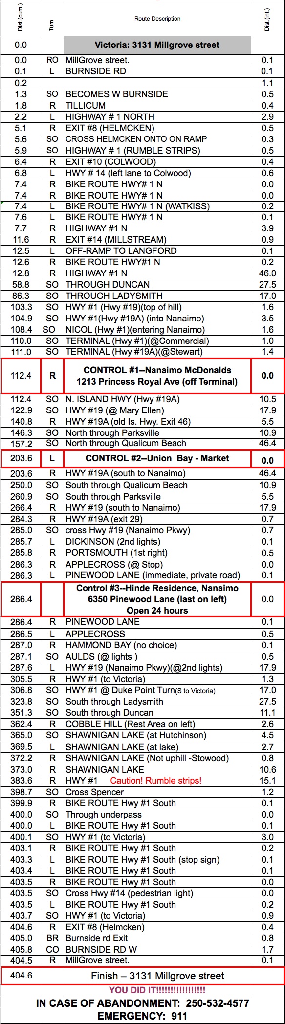 Highway to Hell 400 May 12, 3 a.m. Ride Organizers: Start/Finish: Victoria, Croy house, 3131 Millgrove Street Route Sheet |