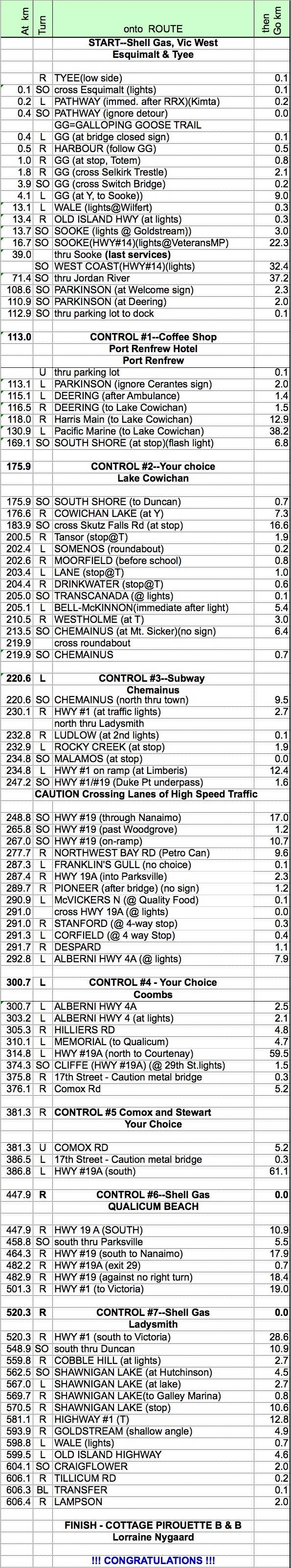 Renfrew Ramble - 600 km May 26, 6:30 a.m. Start: Victoria West - Esquimalt, Shell Gas, Esquimalt & Tyee Finish: Victoria West - Esquimalt, Lorraine's Place - Cottage Pirouette B&B, 401 Lampson Street Route Sheet |