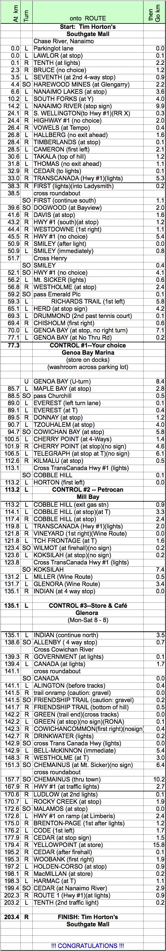 Tour of Nanaimo and Cowichan Valleys 200 km June 16, 7 a.m. Ride Organizer: Start/Finish: South Nanaimo: Tim Horton's, Southgate Mall, Chase River, 10th Avenue Route Sheet Map, etc. Stephen's Notes |