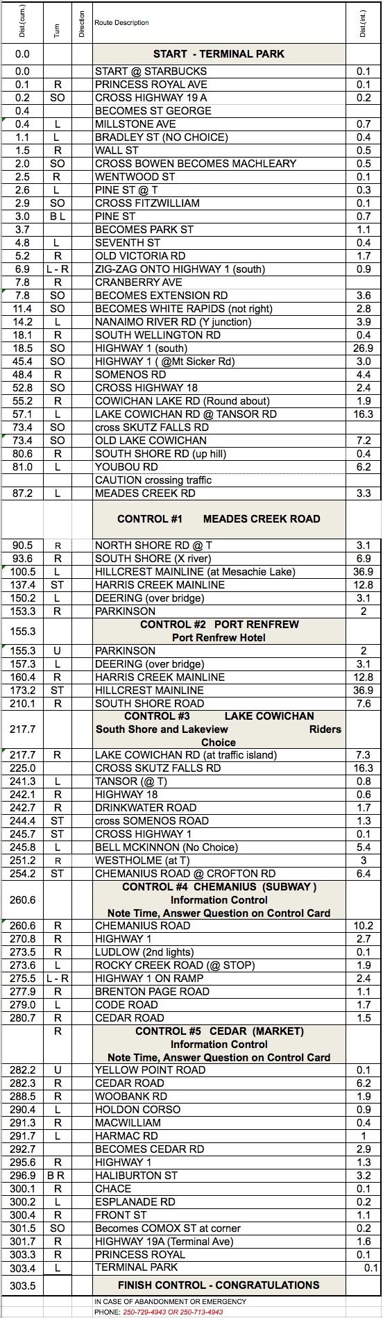 Renfrew 300 km June 30, 6 a.m. Ride Organizer: Start/Finish: Nanaimo, Starbucks @ Terminal Park Mall Route Sheet |