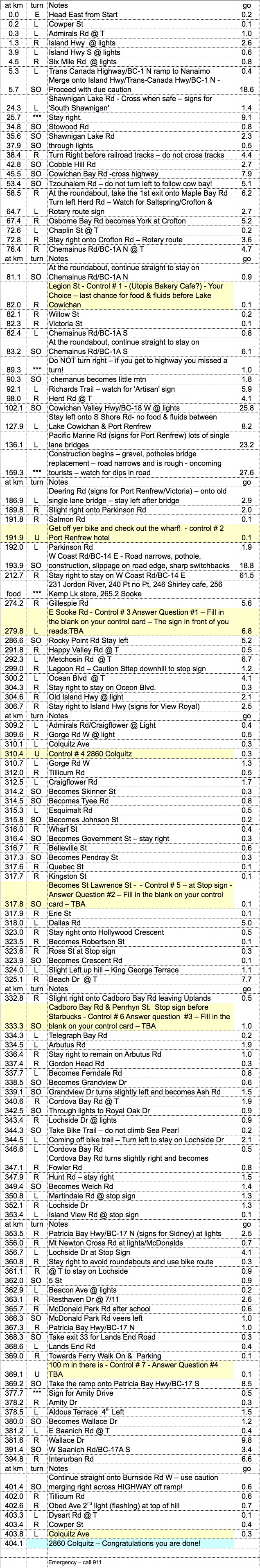 Southern Coast 400 km July 14, 5 a.m. Ride Organizer: Start/Finish: Victoria, 2860 Colquitz Ave Route Sheet Map Notes from Steve at bottom of page |
