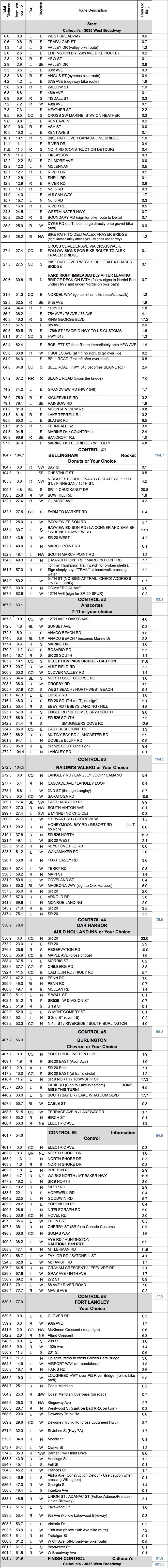 From route coordinator Gary Baker, August 15, 2013: Keith Patterson has redesigned this route to incorporate suggestions from riders who did this ride last year. There are two major changes: 1) the start time has been moved forward to 6AM and 2) the ride going south to Whidbey island has been shortened by approximately 20km and distance added to the return portion of the route. These changes were made to give riders more daylight riding time at the south end of the Whidbey island portion of the route. Now riders will get to see those hills! NOTE: There will be NO staffed control at the recommended night control in Oak Harbour. Riders will have to book their own accommodation if they plan a sleep stop. last year the control was at the Auld Holland Inn at the north end of the city.