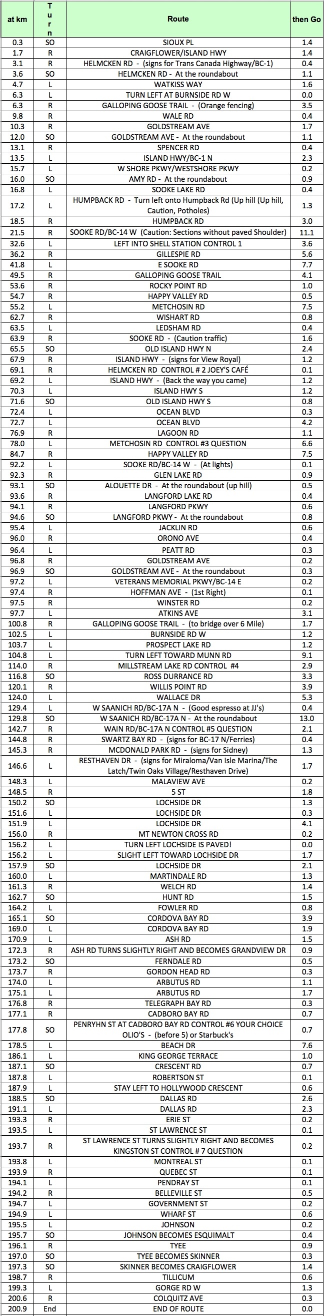 CRD Challenge 200 (Capital Regional District) June 1, 7 a.m. Ride Organizer: Start/Finish: Esquimalt Gorge Park parking lot off Tillicum Road between Craigflower and Gorge . Gorgeuos coffee will open early (6 AM) at the corner of Tillicum and Gorge. Additional route info from organizer Steve at the bottom of this page. Map Route Sheet Route Sheet |