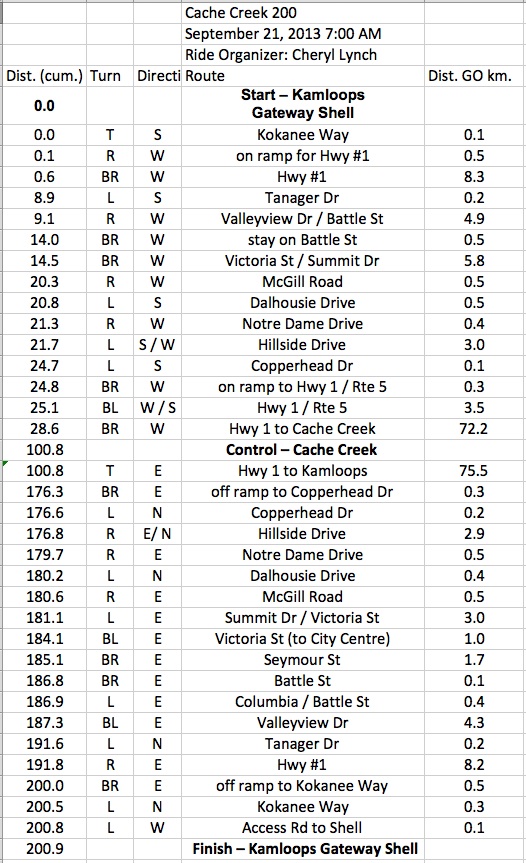 Cache Creek - 200 km September 21, 7 a.m. Ride Organizer: Start / Finish: Gateway Shell Map Etc. Route Sheet or this (below): |