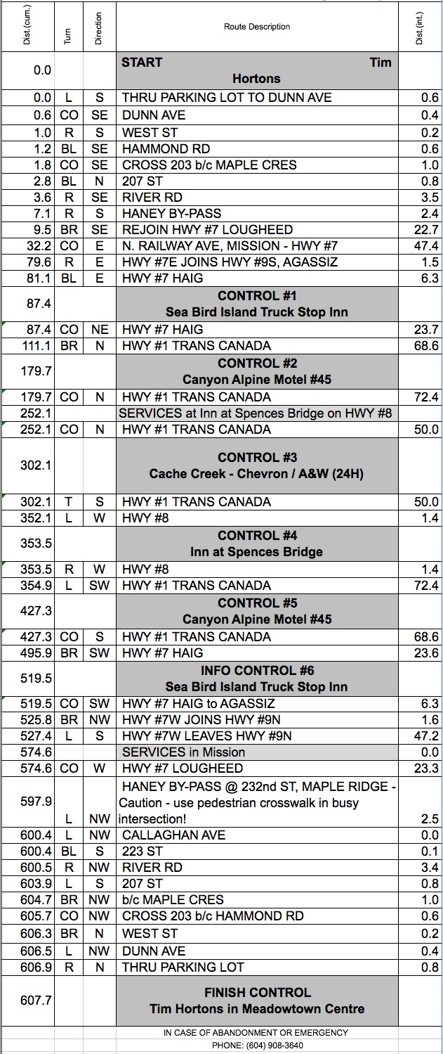 There is a motel in Boston Bar as well at 430 km. This control will be staffed (and is a control on both out and back legs), also with a bag drop. Please book your own room if you plan to sleep there.