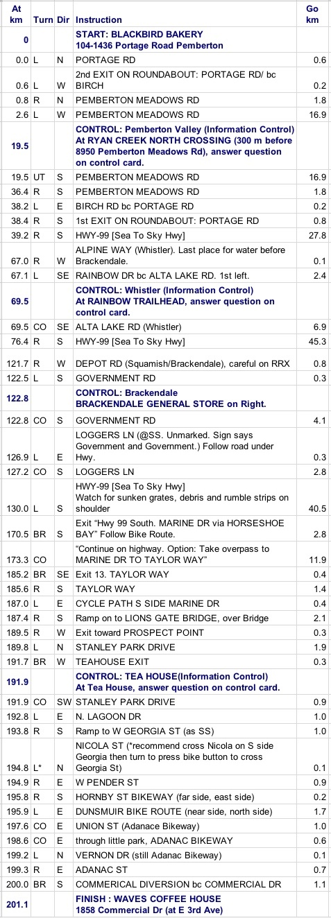 Lower Mainland Brevets Ride Organizers: Start: Pemberton: Blackbird Bakery, 104 - 1436 Portage Road Route Sheet Map etc. Notes |