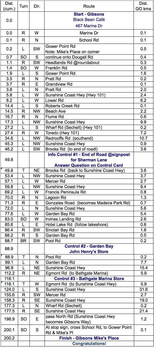 Sunshine 200 August 16, 9 a.m. Ride Organizer: Start: Gibson's: Black Bean Cafe, 467 Marine Drive (just before Molly's Reach) Map - start/ifnish locations Route Sheet Pre-ride: Route notes & other info |
