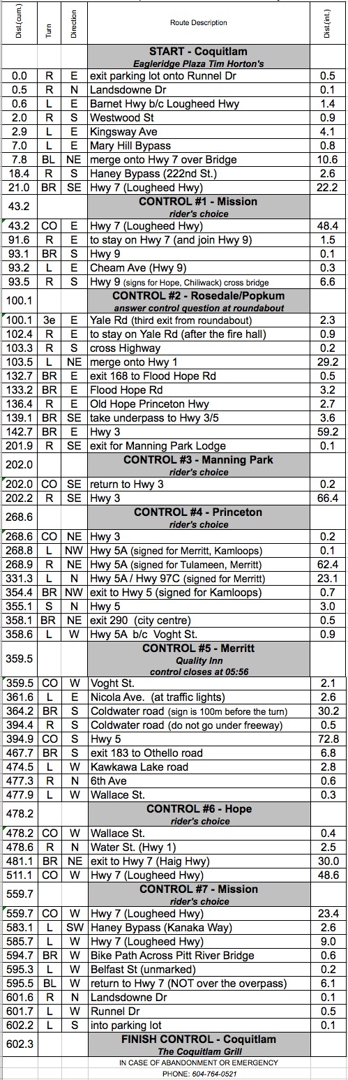I will not be providing food at the control (maybe some drinks though.) There is an all night Tim Horton's in Merritt, just after leaving Hwy 5, about 200m before the control. There is a 7-11 store about 2km past the control. And there will be a bag-drop. Please plan accordingly.