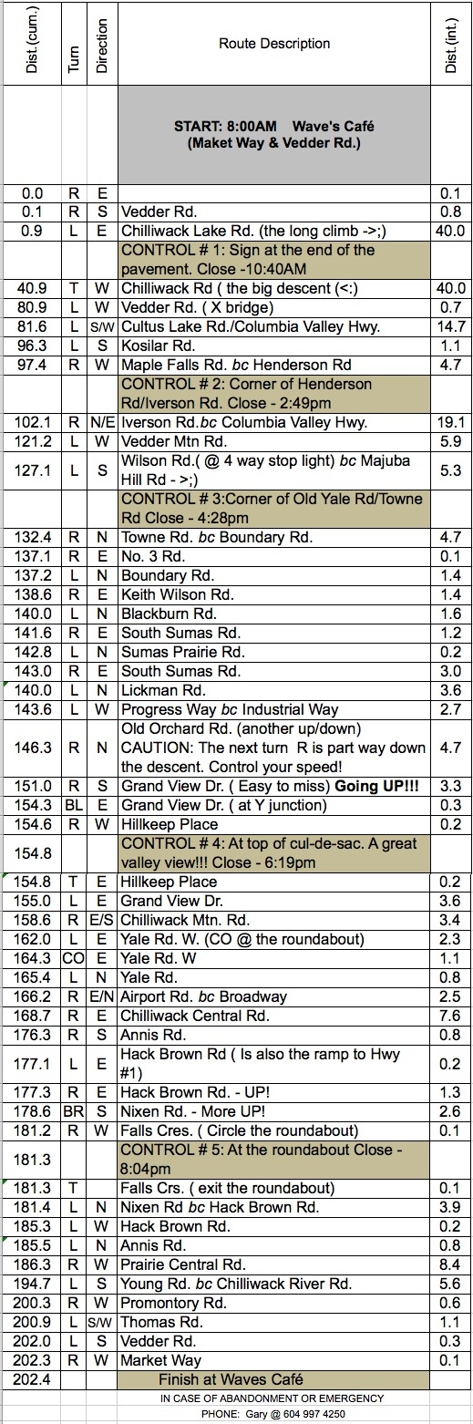 Chilly 200 September 19, 8 a.m. Ride Organizer: Start/Finish: Chilliwack: Waves Cafe, Market Way & Vedder Road Route Sheet Other Info |