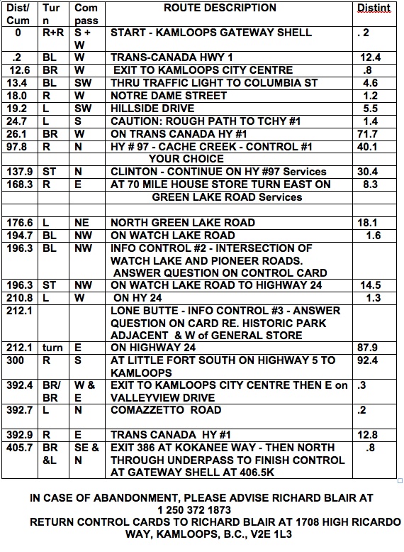 Cariboo Loop 400 km May 24, 5 a.m. Ride Organizer: Start/Finish: Kamloops: Gateway Shell Route Sheet |