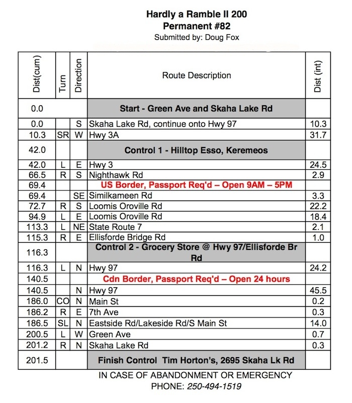 Hardley a Ramble 2 200 km September 27, 7 a.m. Ride Organizers: Start/Finish: Penticton: Green Ave & Skaha Rd Route Sheet Map |