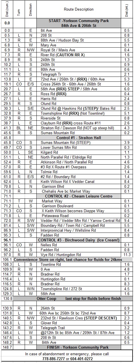 | Note: This is not the official route sheet. Ride organizers may make last minute changes because of road closures or other problems. The route sheet you receive at the start of the ride is the official one. |