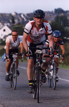 riding together at the beginning and There are a couple of important lessons that can be drawn from Larry's experience. To begin with, there does seem to be some truth to the "myth of muscle memory"; i.e., it's not a myth. If you have done a lot of riding in the past, you really do seem to be able to get away with skipping training if you have to. (There will, of course, be limits on your performance.) Is it because your muscles really remember, or are there other factors? Maybe your body is simply remembering its most efficient pace and riding positions. I can't pretend to have a full understanding of this curious phenomenon. I can say though, that there have been a few times in recent years when I too have gotten away with riding randonnées with little or no training - a short cut that I would not have been able take as a new cyclist. A not unrelated issue is the value of experience. Probably without even having to think about it, Larry would have known his body's limits and would not have pushed his pace beyond what felt safe. He would have known how much food and water was necessary and when to consume it. He would have known the route well and wouldn't have had any anxieties about unexpected difficulties ahead or straying off course. Larry's case also points to the importance of strategic training. Larry was very short on time in spring '98 but he knew that the Manning Park, Spences Bridge, Coquihalla 600 contained some challenging hills. After the spring 400 he spent his precious training time on the road which goes up to Simon Fraser University on Burnaby Mountain near where he lives. He still wasn't putting in a lot of time, but he was making the most of it, and in the end he again got away with murder - he survived one of the most hilly 600 km brevets in the club's repertoire. I have two closing points. The first is that Larry's 1998 results are remarkable. The second point is that I would never in a million years recommend his methods to anyone but the most experienced cyclist, and by the way, Larry doesn't recommend them either - ADOPT THE LARRY WASIK RANDONNEUR TRAINING PROGRAM AT YOUR PERIL. 2001 update... Larry completed the 200, 300, 400 and 600 km series and by the end of the year he had a grand total of 1526 km on his bike. You do the math. And Oh, by the way, he rode to the start of the 200 and 400. 2008 update... Larry admits with wisdom and age that he is now doing more regular exercise with weekly spin classes and says that really helps to take the edge off the first 200 of the season. © Eric Fergusson 1999, revised as needed |